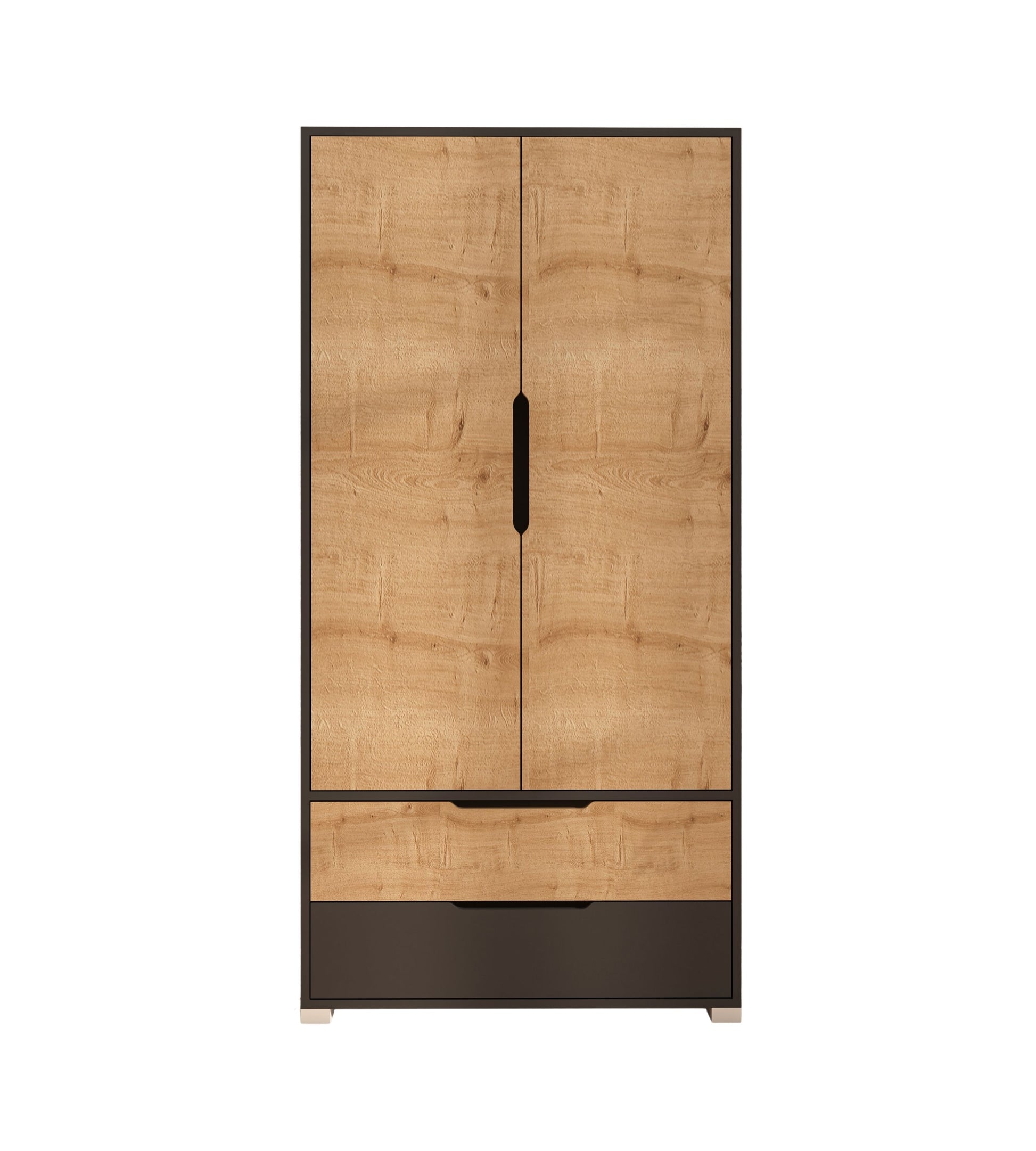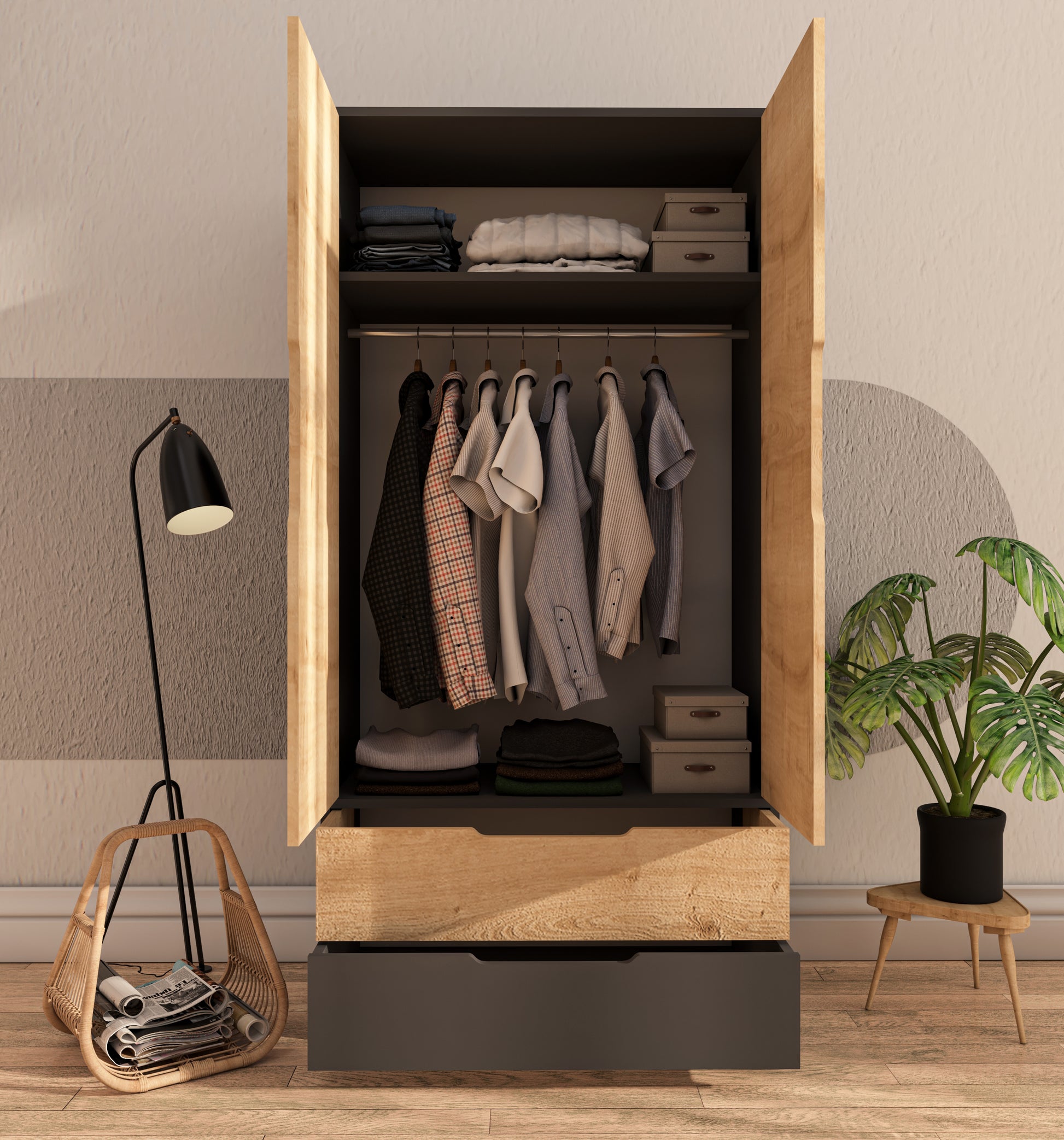 Flora 2 Kapaklı 2 Çekmeceli Gardırop Antrasit - Safir Meşe Elbise Dolabı