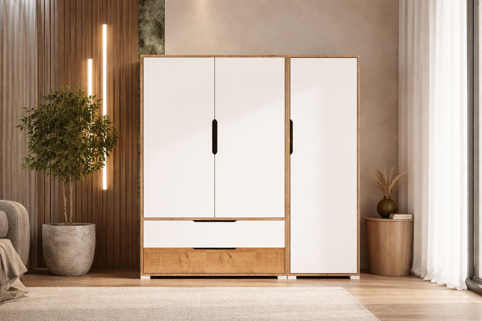 Üç kapaklı ve iki çekmeceli yapısı sayesinde kıyafetler, tekstil ürünleri ve günlük eşyalar için pratik bir kullanım sağlar. Dengeli ölçüleriyle alanı verimli kullanmanıza yardımcı olurken, sade çizgileriyle farklı dekorasyon stillerine kolayca uyum sağlar.