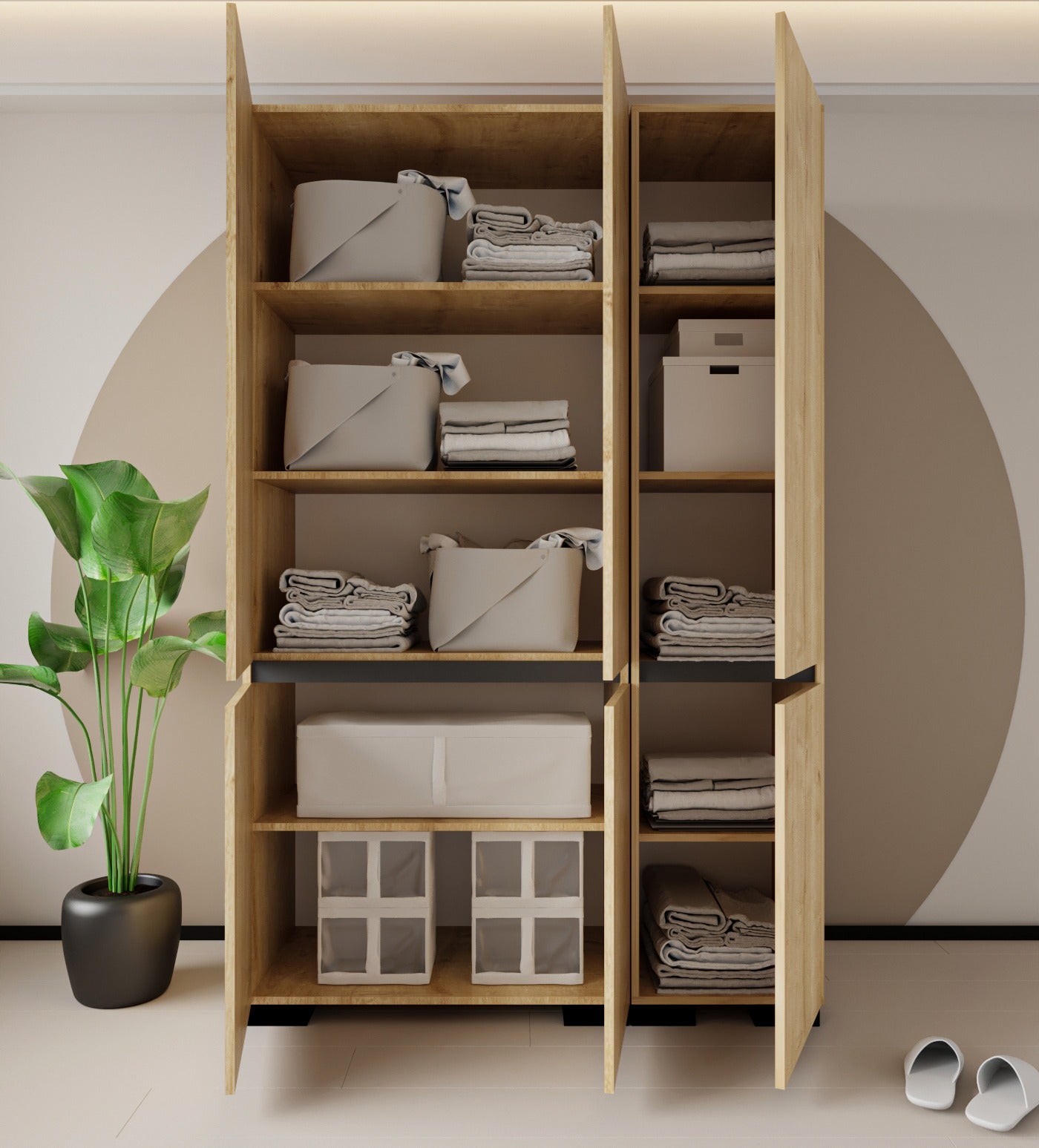 Altı kapaklı yapısı sayesinde kıyafetler, tekstil ürünleri ve hacimli eşyalar için oldukça geniş bir iç hacim sağlar. Yüksek formu, alanı verimli kullanmanıza yardımcı olurken sade çizgileriyle farklı dekorasyon stillerine kolayca uyum sağlar.