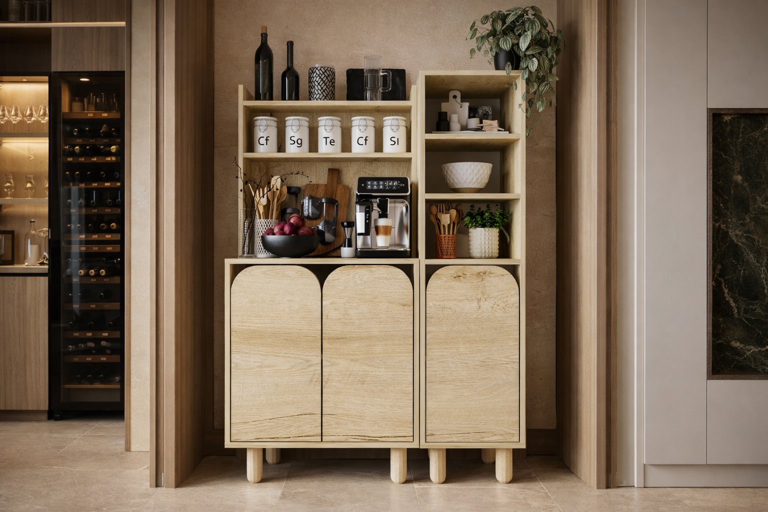 Üç kapaklı geniş iç hacmi sayesinde mutfak gereçleri, kahve ekipmanları ve günlük kullanım eşyaları için düzenli bir saklama alanı oluşturur. Dengeli ölçüleriyle alanı verimli kullanmanıza yardımcı olurken, sade tasarımıyla farklı dekorasyon stillerine kolayca uyum sağlar.